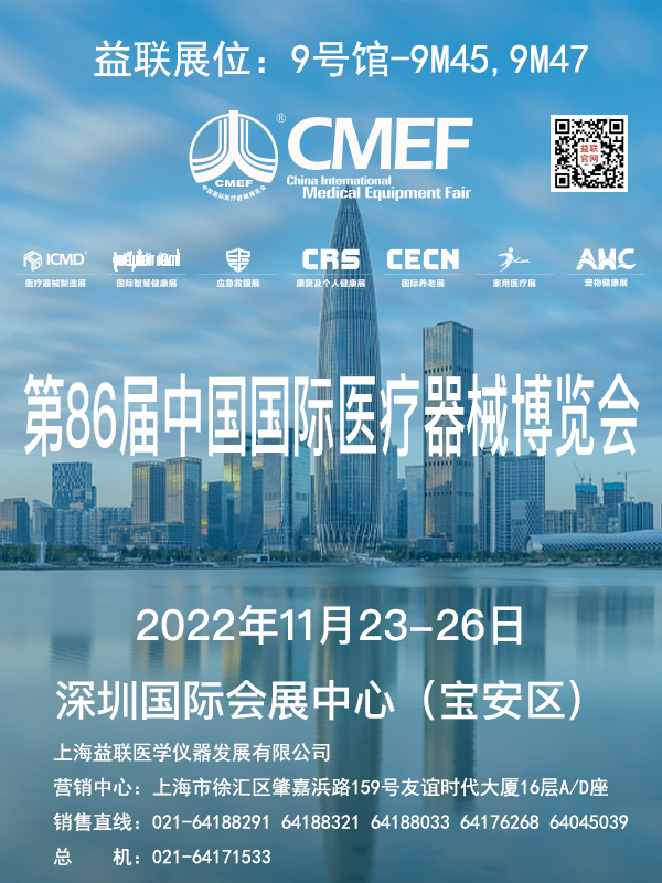 您好!2022第86屆中國國際醫(yī)療器械博覽會(CMEF),將于2022年11月23日至11月26日在深圳國際會展中心(寶安區(qū)·新館)舉行,上海益聯(lián)醫(yī)學(xué)儀器發(fā)展有限公司屆時將組團參展。歡迎您的光臨洽談!