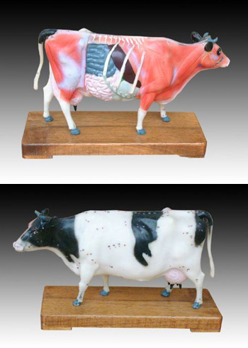 本模型顯示牛體左半部68個常用穴位,穴位用數(shù)字標注。右半部顯示解剖面。用PVC制成,供獸醫(yī)作參考用。