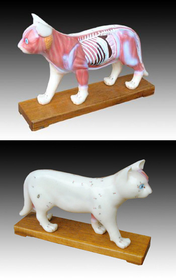 本模型顯示貓?bào)w左半部36個(gè)常用穴位,穴位用數(shù)字標(biāo)注。右半部顯示解剖面。用PVC制成,供獸醫(yī)作參考用。