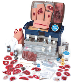 該套模型包括7套流血性傷口,15種創(chuàng)傷粘貼件,可組合70多種創(chuàng)傷情景