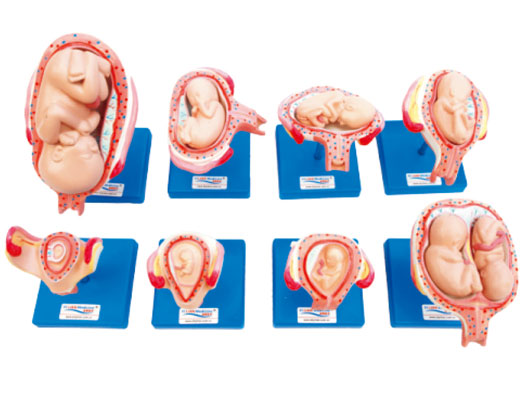 功能特點:該模型由妊娠胚胎發(fā)育過程一、二、三、四、五、六、七個月胚胎和五個月雙胞胎等8個模型組成,期中四、五、六、七個月胚胎和五個月雙胞胎模型胎兒可以取出,并顯示子宮、陰道、胎兒、臍帶、胎盤、羊膜腔以及卵巢、輸卵管等結構。