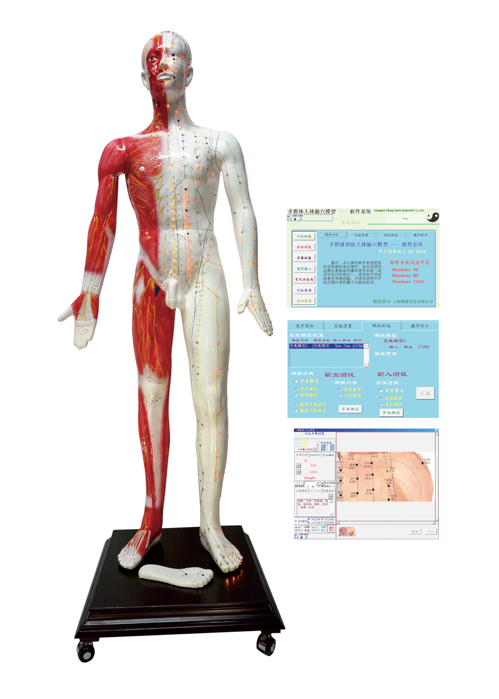 光電感應(yīng)多媒體人體針灸穴位發(fā)光模型由上海中醫(yī)藥大學、上海市針灸經(jīng)絡(luò)研究所研制并監(jiān)制。模型按國標GB12346-90定位生產(chǎn),針灸穴位共409個。軟件含“子午流注”。